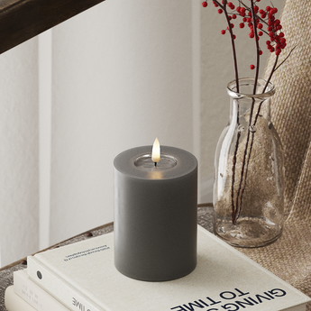 Toto elegantní LED blokové světlo Šedá Nabízí efekt „skutečného plamene“ v reálném životě, který je stejně živý jako skutečná svíčka. S výškou 10 cm a průměrem 7,5 cm je každé blokové světlo LED pečlivě vyrobeno ze svíček a pryskyřice, vybavené živým 3D plamenem a jedinečným povlakem pryskyřice nahoře. Tato konkrétní kombinace nejen vytváří autentický pocit, ale také dává výrazný „mokrý vzhled“, který dokonale napodobuje roztavené svíčky.