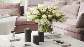 Brug bloklys i små grupper med forskellige højder. Det giver dybde og et gennemført udtryk i indretningen.